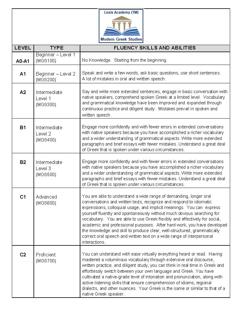 During each course, at a progressively increasing level of fluency development that is achieved through structured practice and extensive drills, students build the language acquisition skills required to read, write, listen, understand, and speak Modern Greek as it is spoken by native Greek speakers.